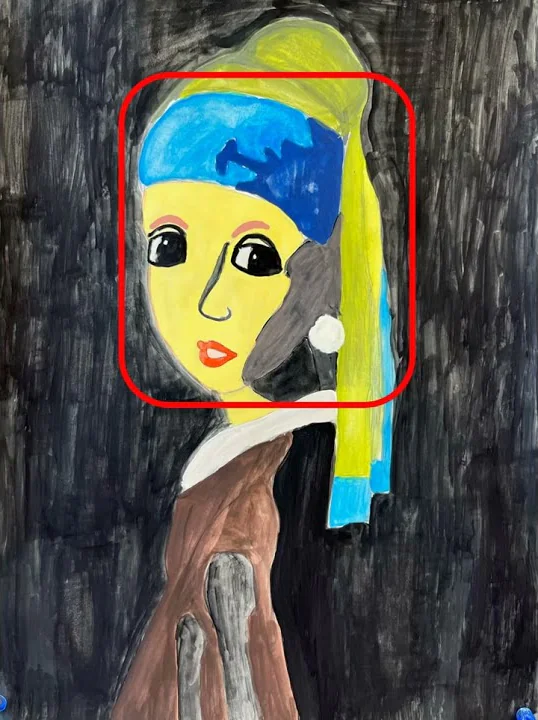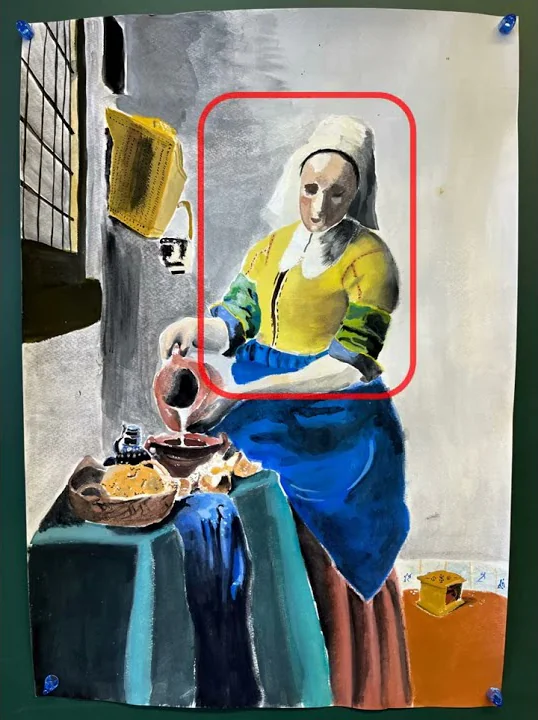 私は今年のテーマが名画のオマージュだと決まったときに、「どの名画にしようか。」と、とても悩みました。悩んだ末に私は、フェルメールの牛乳を注ぐ女にしようと決めました。私が描いているとき、とても大変だと思ったことは下書きです。実際のものよりも画用紙が縦長なので、そこをうまく調整しなければならず、とても難しかったです。