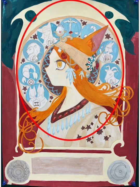 私は今回ミュシャの絵をオマージュしました。 この作品は緻密に描かれた背景や装飾品の美しさが魅力だと思います。