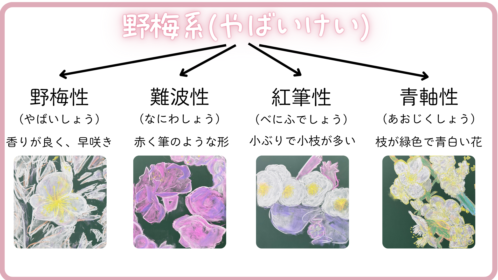 野梅系はさらに、野梅性、難波性、紅筆性、青軸性の4つの性に分けられます。