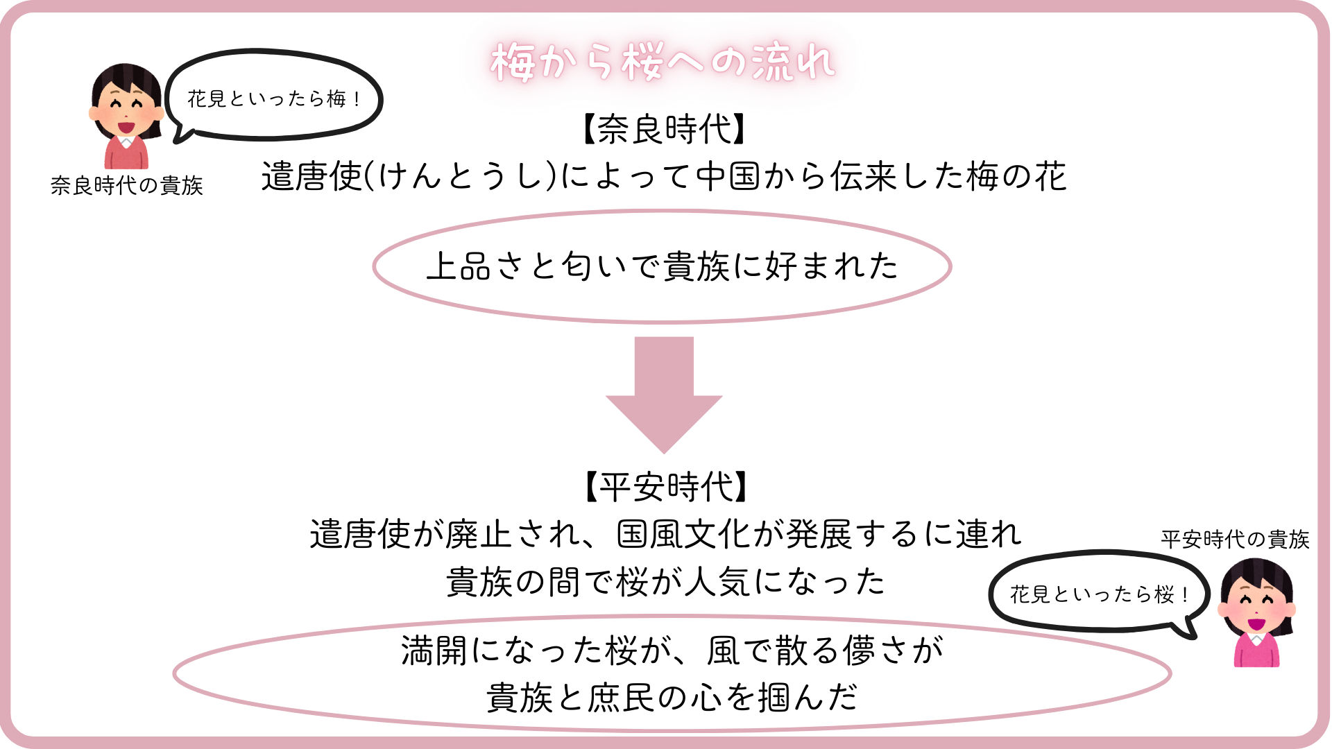 桜の木は神聖な木として豊作を願う農民の間でも桜が親しまれ、庶民に広がったそうです。また、梅は匂いが少しきつく、桜のほうが花の量が多く、豪華に見えるため、桜のほうが人気になったのだと考えました。