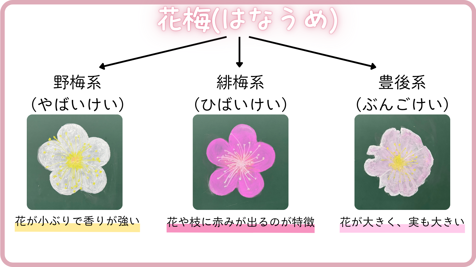 そして、花梅は野梅系、緋梅系、豊後系の3つに分けられます。