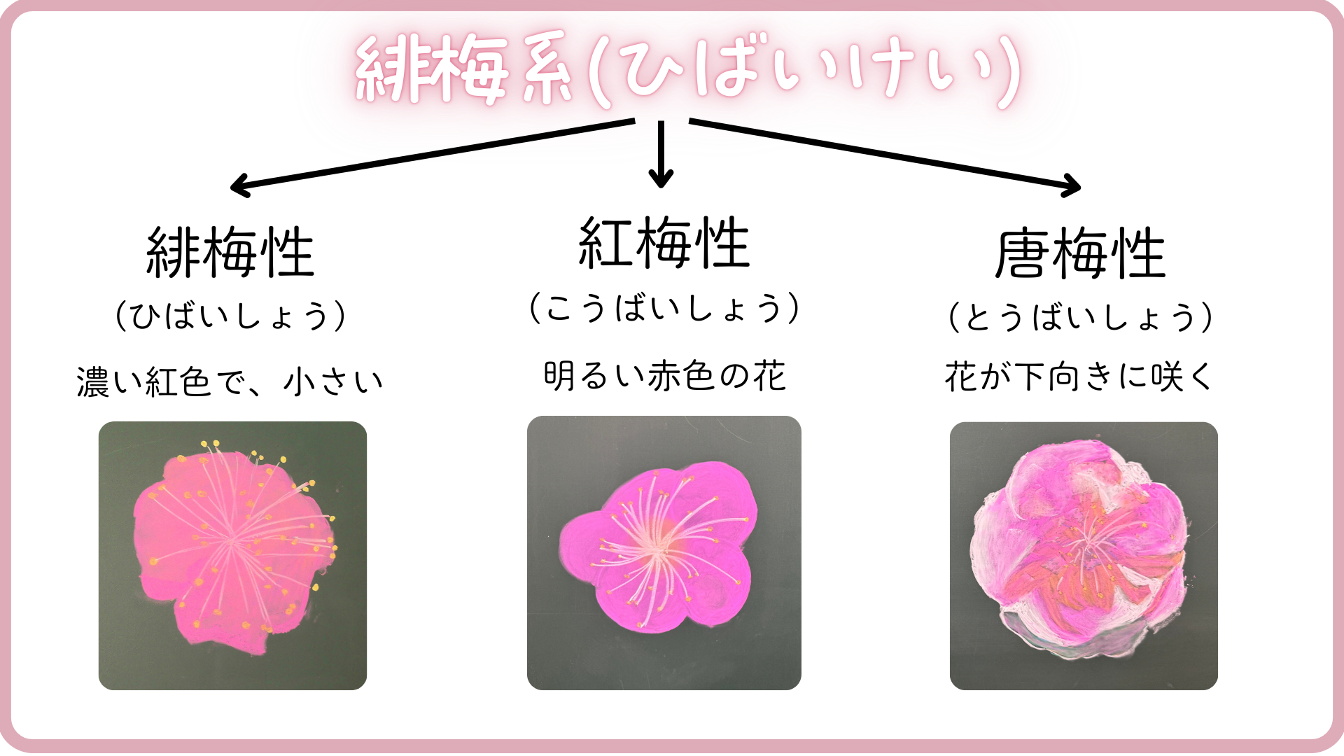 緋梅性、紅梅性、唐梅性の3性に分けられます。
