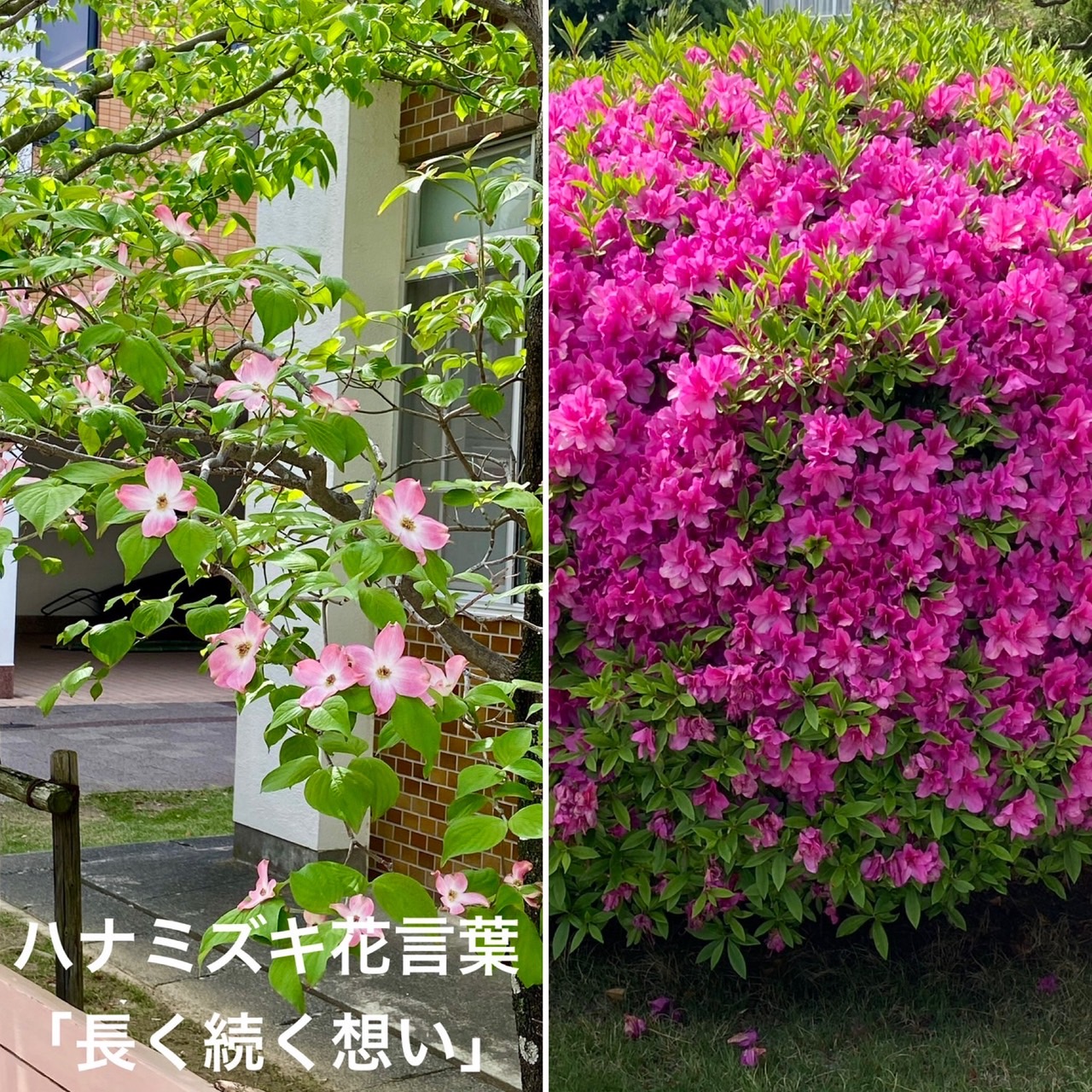 新緑が眩しい頃になりました。正門で停止礼をして顔を上げると桜の葉が繁っているのが目に入ります。そして、大きなツツジ等学園内には綺麗な花々が咲いています。