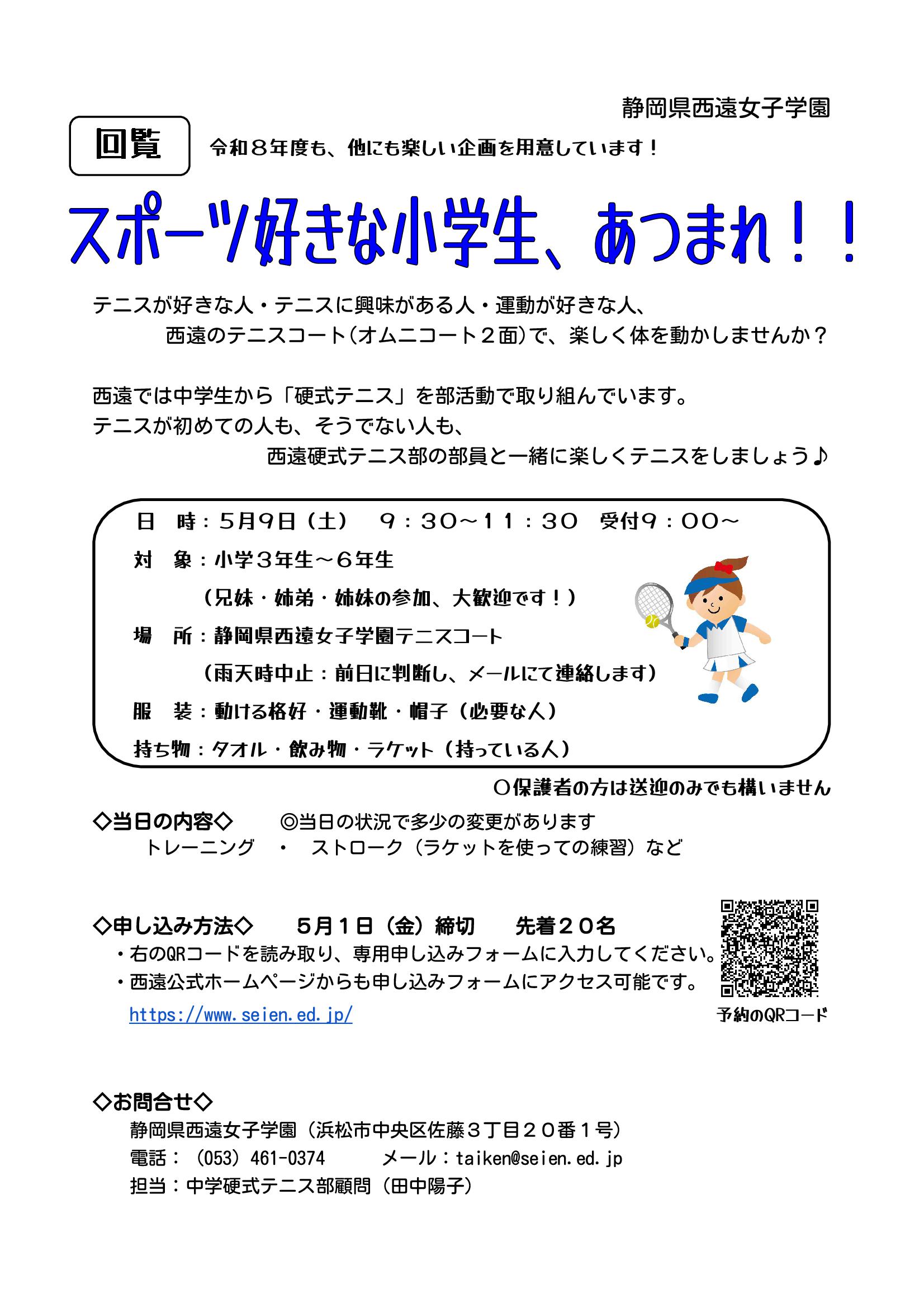 【小学生体験イベント】5/9(土)テニス体験教室 スポーツ好きな小学生、あつまれ!! テニスが好きな人・テニスに興味がある人・運動が好きな人、 西遠のテニスコート(オムニコート2面)で、楽しく体を動かしませんか? 申込はこちらから