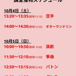 お知らせ 学園祭講堂催物スケジュール 今年度の講堂催物には、空手部、ギターマンドリン部、演劇部、筝曲部、バトン部、ダンス部の6部活が出演してくれることになりました。 当日の発表に向けて、出演部活はもちろん練習に励んできたと思いますが、催物部の実行委員も照明や音響、アナウ... 2025.10.03 お知らせ