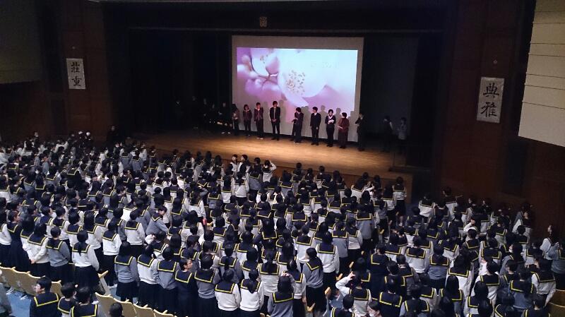 今日は午後の授業を休止して、まもなく卒業を迎える6年生のお別れ会を全校で行いました。昨年までは高校生のみで行っていたお別れ会ですが、今年は1年生から6年生まで全員が講堂に会し、お別れ会を行いました。