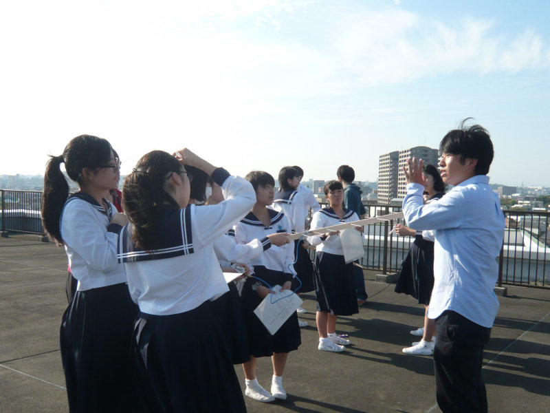 生徒たちは4つのグループに分かれ、アンテナ係,受信機係,記録係といった役割分担をし、内山先生や3人の実験助手のみなさんから機器の扱い方等を教えていただきました。その後、東館の屋上に上がり、まずリハーサルです。きれいな秋空が広がり、絶好のコンディションです。アマチュア無線の電波が飛び込んで来ることもありましたが、リハーサルは順調に進みました。