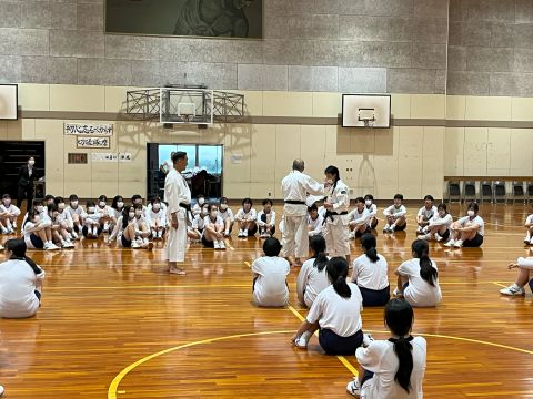 また、7時間目は体育館で『静岡県警察少林寺拳法部』の方々から、中学部の生徒に『護身術』を教えていただきました。