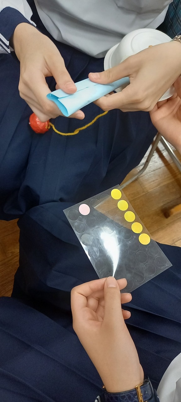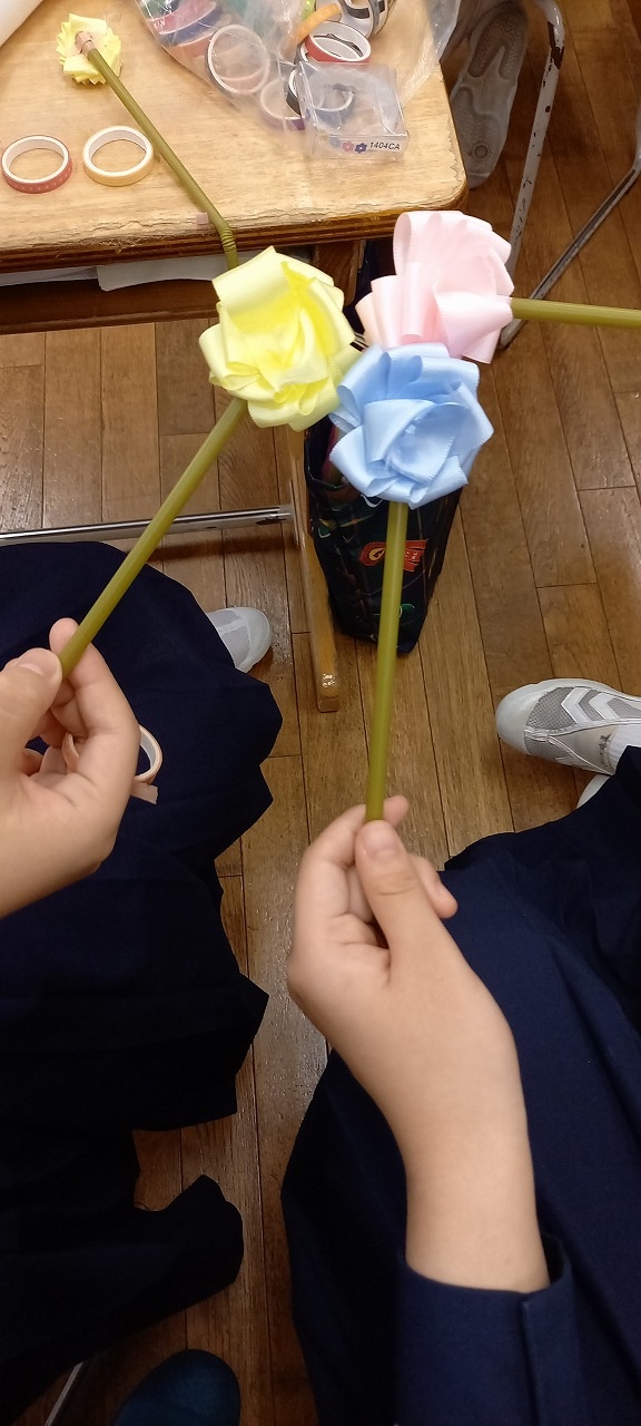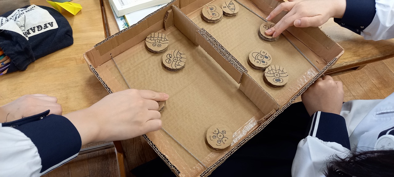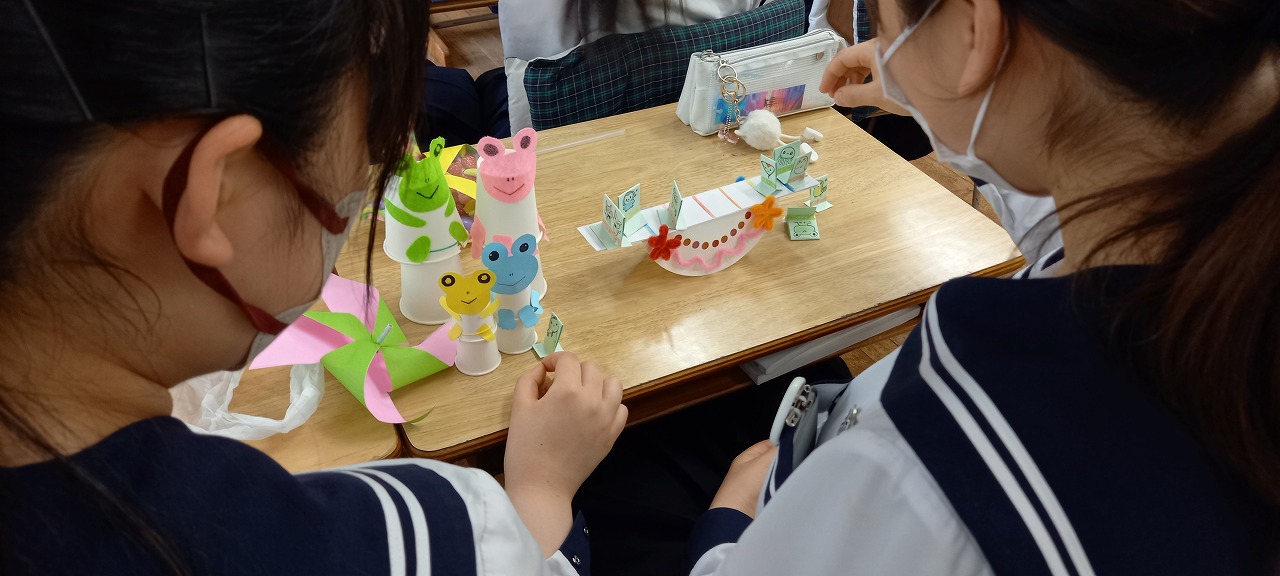 5年生の家庭科の授業中。来週には幼稚園に出向くので、その準備として、遊び道具を手作りしていました。園児の皆さんに見て触れて動かして楽しんでもらえるように、工夫を凝らしています。グループごと、全て違う種類の玩具を用意していたのも、素晴らしい気づかい。そして、何よりも物づくりの品質の高さに感動しました!