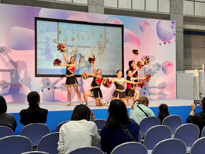 今回は高校2年生がチアダンスを披露し、会場に笑顔を届けました。ステージ終了後には、生徒とブース出展を覗かせてもらい、ステージを観てくださったメーカーの方々から温かいお声をいただく場面もありました。
