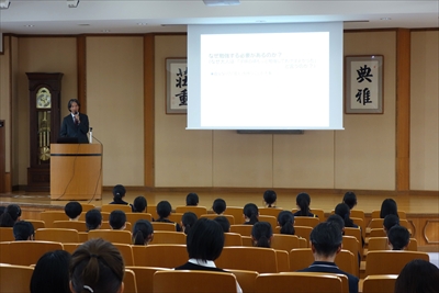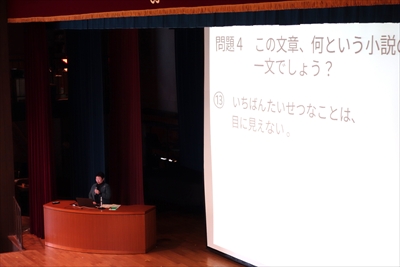 中学生は1時間目に「読書について」校長先生の講堂朝会があり、クイズに挑戦したりして読書の楽しみと大切さについて学びました。