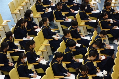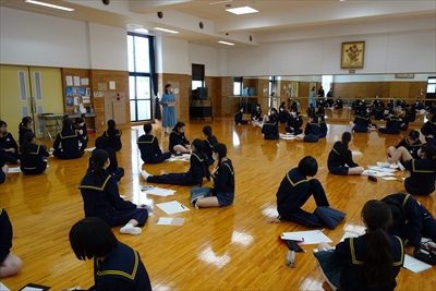 高校2年生は前日までの九州研修旅行の振り返りとまとめをした後は、「女性に生き方を考える弁論大会」のクラス予選会を実施。4時間目は上手な指示の出し方を学ぶピア講習を受講しました。