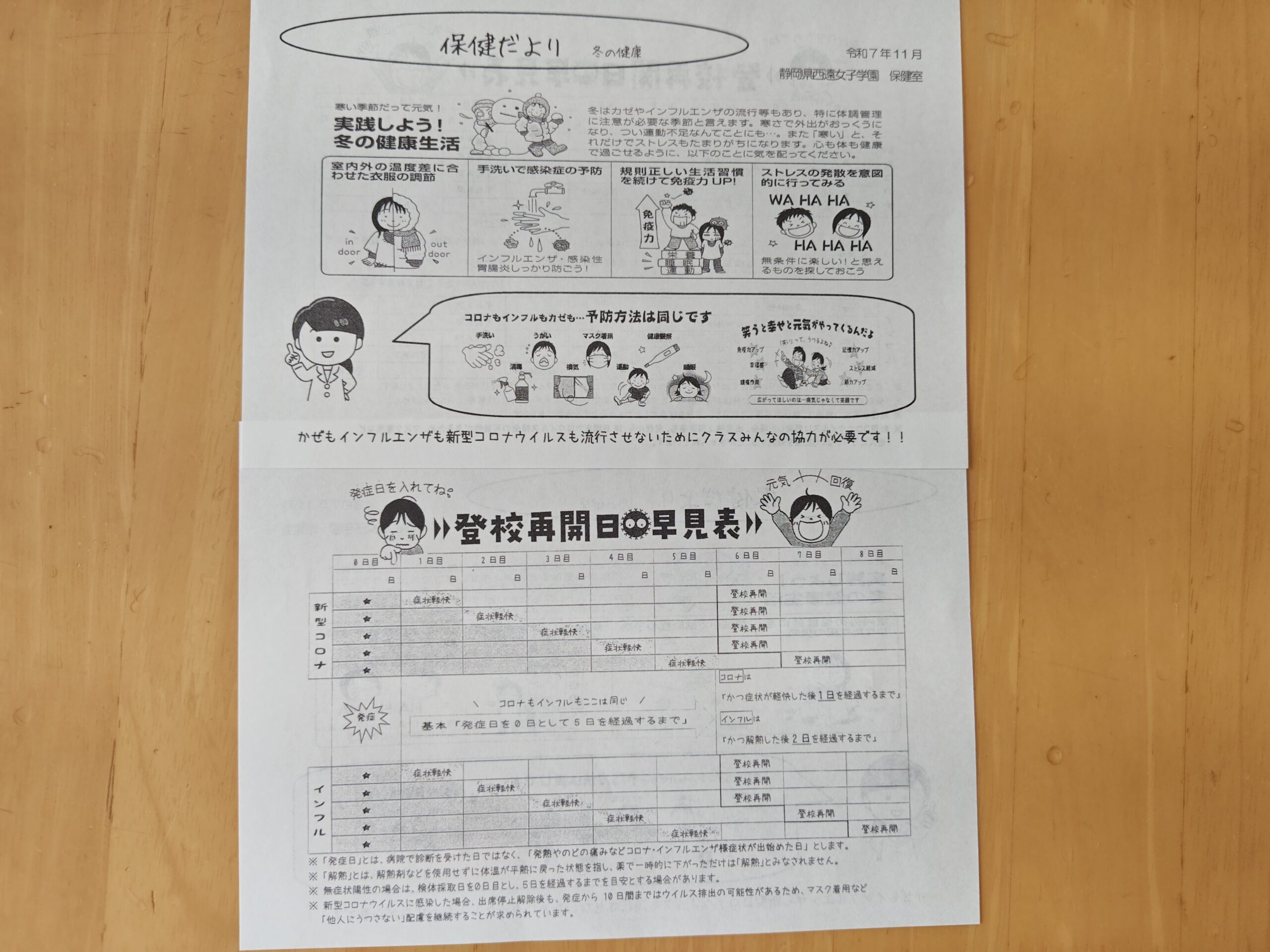 これから流行しやすくなる、かぜ・インフルエンザ・新型コロナを防ぐには、特別なことよりも日々の生活習慣が鍵になります。手洗い、咳エチケット、十分な睡眠と栄養、教室の換気を意識するだけでも予防効果は大きく変わります。体調がすぐれない日は無理をしないことも大切です。一人ひとりが予防行動を続けることは、自分の健康を守るだけでなく、周りの大切な人を感染症から守る力にもつながります。体調管理に気をつけて、この冬も元気に過ごしましょう。