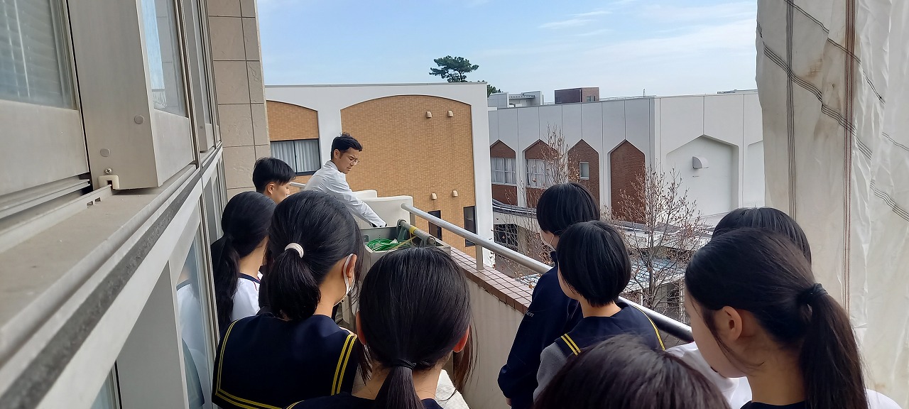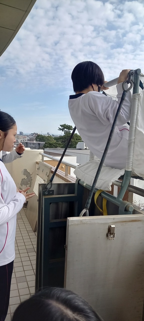 いざとなったら使用するかもしれない、普段は意識しない学校内の避難器具を知ってもらいました。使い慣れている階段で、共に過ごしている仲間と、素早く助け合いながら避難できるのが一番安心ですね。