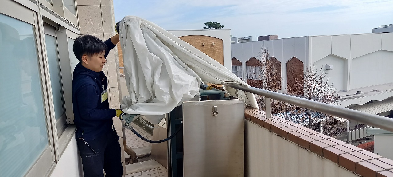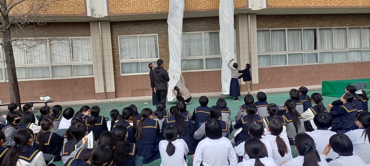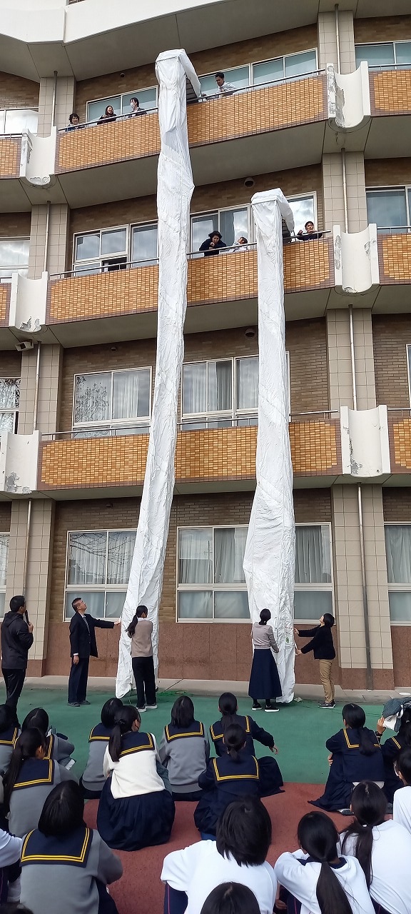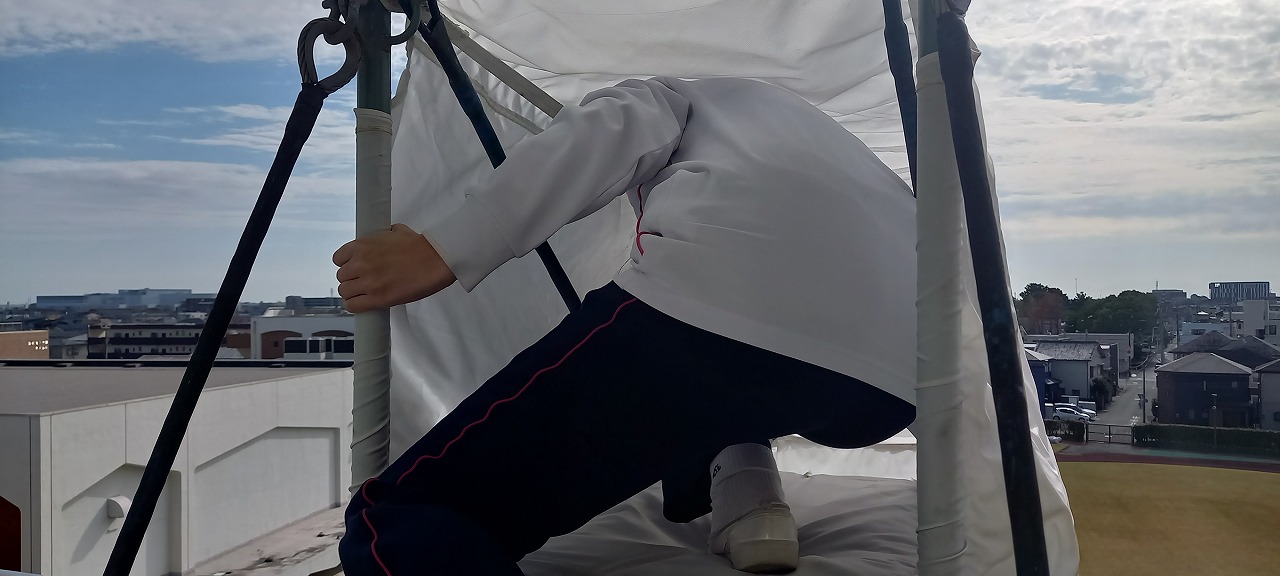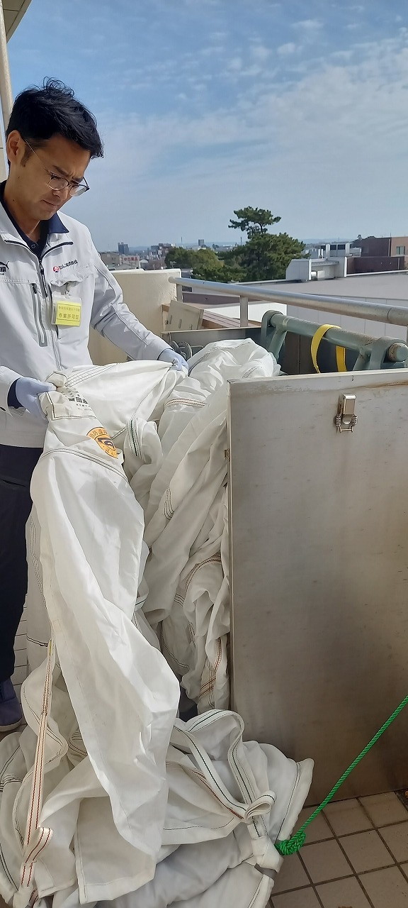救助袋の開け方と脱出の方法を、業者の方に教えて頂きました。緊張の一瞬、足から入ります。中はならせん状になっているので、体をゆだねているとゆっくり降りていきます。白い布で外の様子は見えないので高所の怖さは感じません。みんなの応援の声が近づく中、最後の着地。大事なポイントは底面にお尻を付けた状態で、出口から足を出し、しっかりと両足で地面をとらえて立ち上がること。もしも底面で立ち上がると、浮いているのでゆらゆら揺れて大変です。