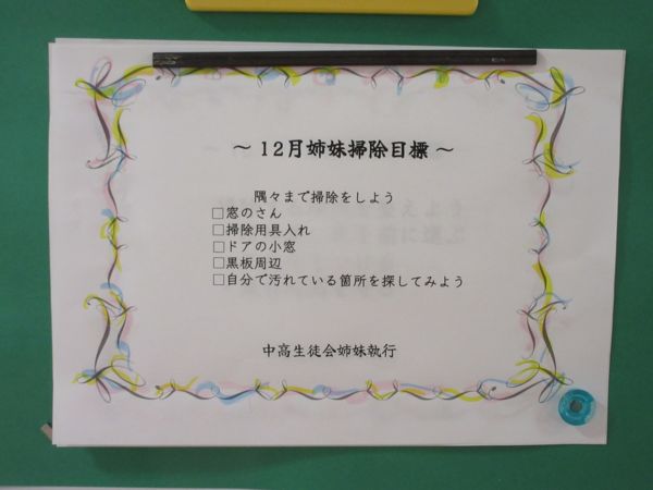 学校全体には、生徒会の姉妹執行より「今月の姉妹掃除目標」が出されています。12月は「隅々まで掃除をしよう」ですが・・