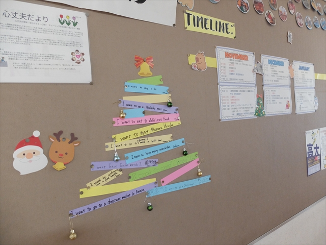4年生の廊下掲示はクリスマスバージョンになっています。英語の授業で書いた英文でクリスマスツリーを作っている途中です。もう少し大きなツリーが完成する予定です。かわいい掲示にワクワクしますね。「I want to・・・」で書かれた英文なので、皆さんが冬休みに何をしたいのか、じっくり読んでみたいと思います。