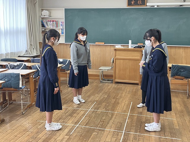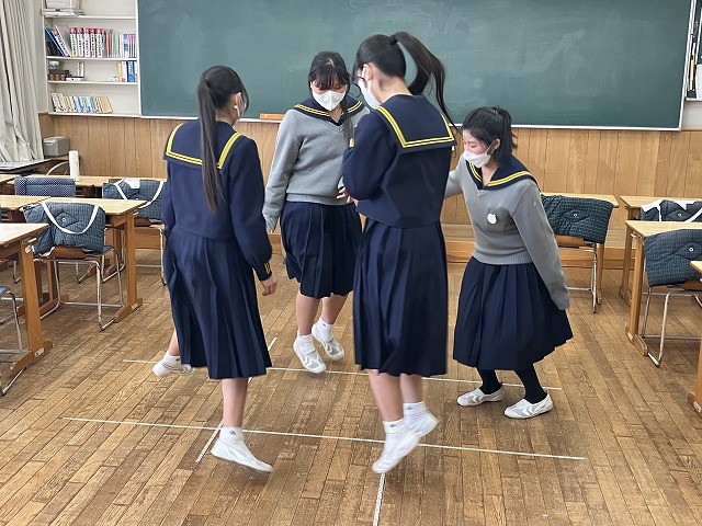 高校2年生たちが床にマスキングテープを貼って準備していました。遊び方の説明を丁寧にした後は、自分たちがお手本を見せていました。