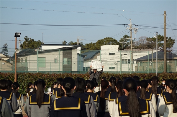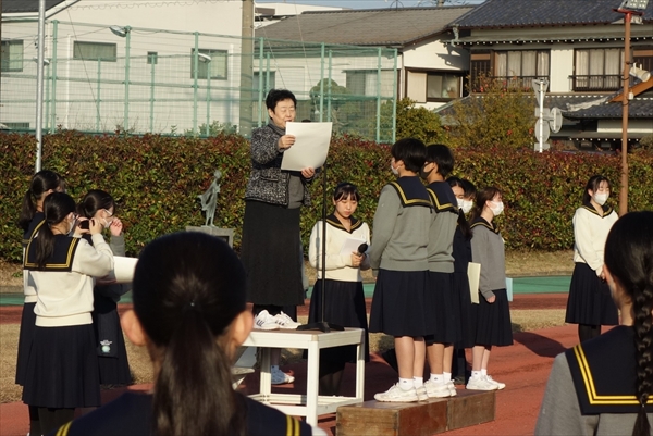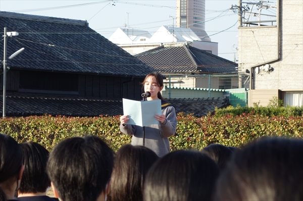 水曜日の朝は全校生徒が校庭に集って「全校朝礼」、授賞・表彰の報告や生徒発表が行われています。本格的な冬が近づく中、本日は天候もよく暖かな日差しの中での全校朝礼でした。