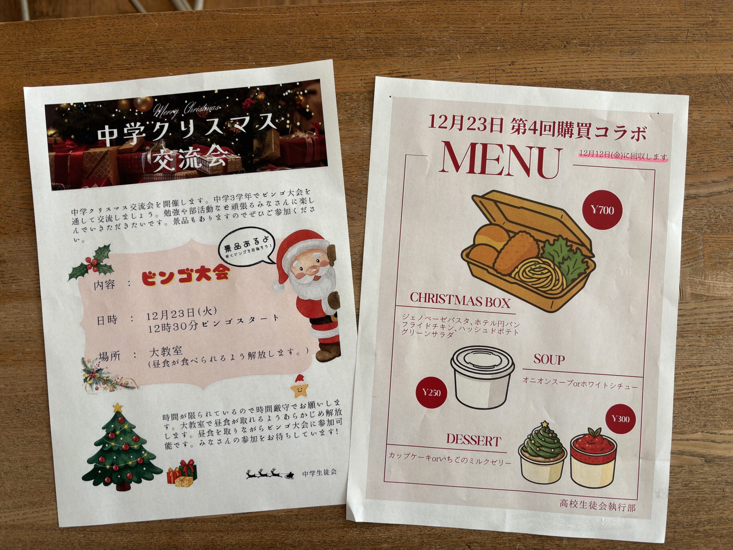 冬休み前のお楽しみ 話題 2025.12.19 西遠では12月25日から冬休みに入ります。その冬休み直前に、生徒たちにとって、ちょっとしたお楽しみが待っています。23日に中学生徒会主催の「中学クリスマス交流会」が行われます。また、高校生徒会とレストランとのコラボ企画の、クリスマスボックス、スープ、デザートも販売されます。 生徒会の工夫が詰まった企画で、冬休みを前に、学校でのひと時を楽しく過ごせそうですね! 文責:岩﨑 裕子