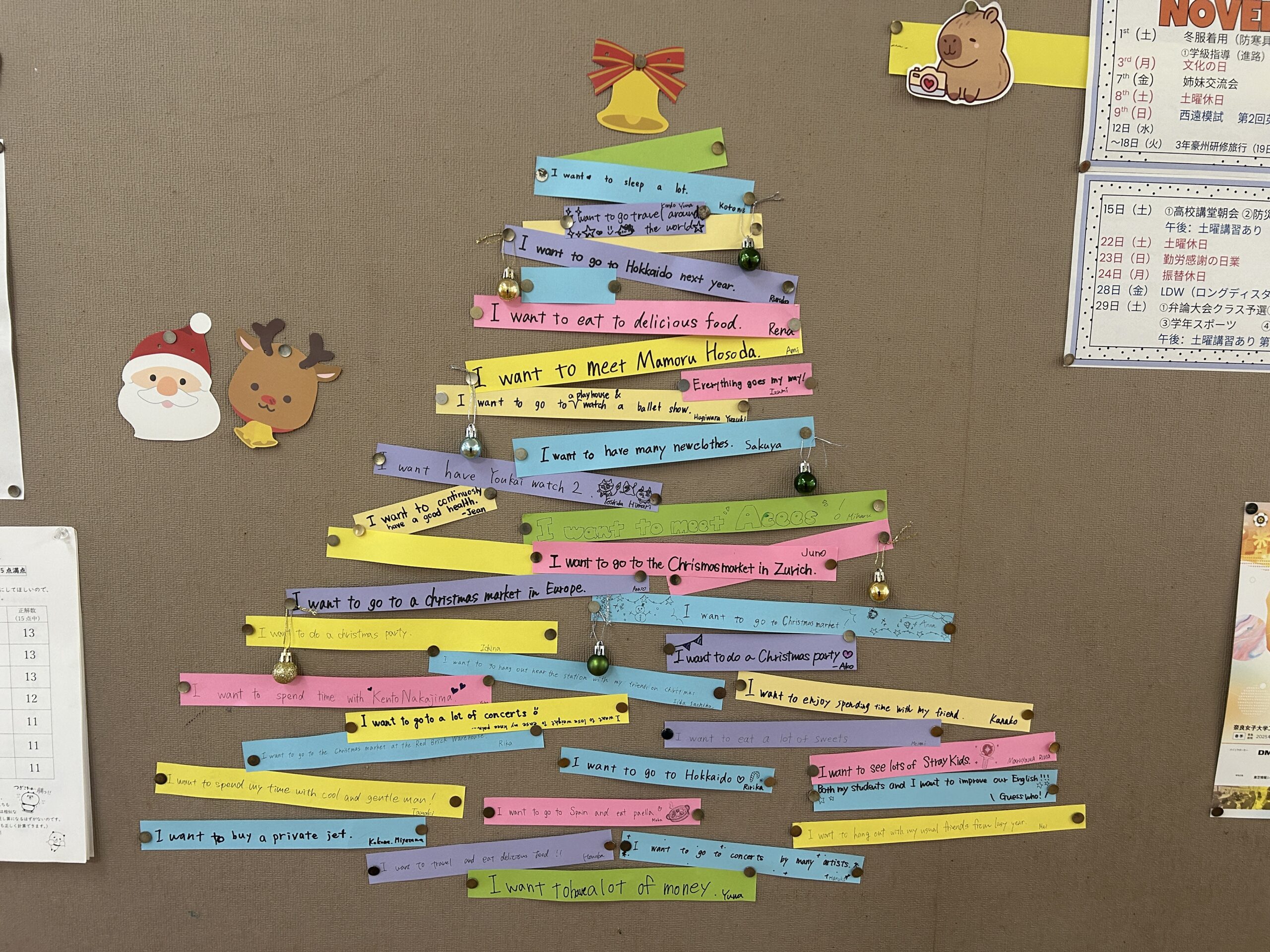 生徒たちの大切な願いが、サンタさんに届き、素敵なクリスマスを迎えられるといいですね。学校全体が、少し早めのクリスマスの雰囲気に包まれています。