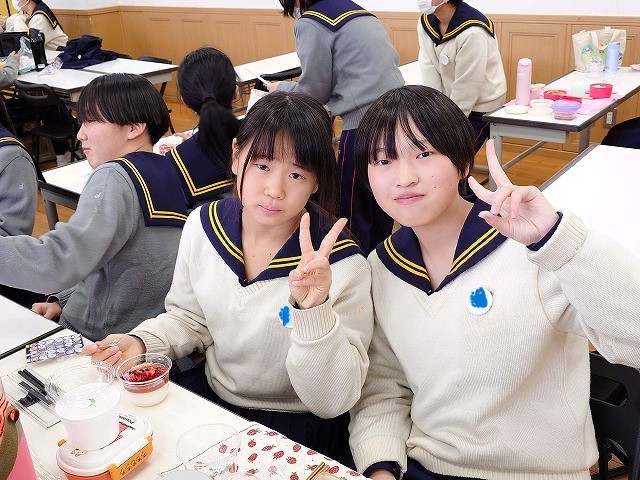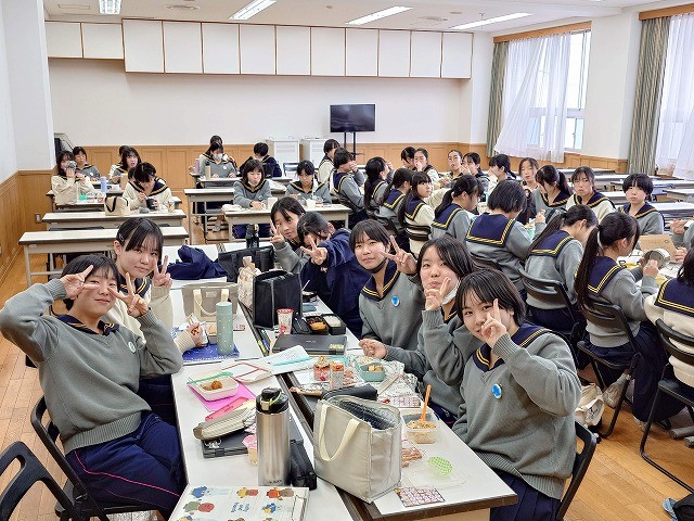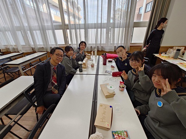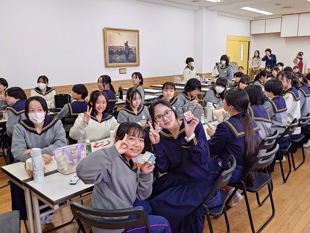 西館の大教室には、クリスマス交流会を楽しみたい中学生たちがお弁当を持って集合し、ますはランチを楽しみます。