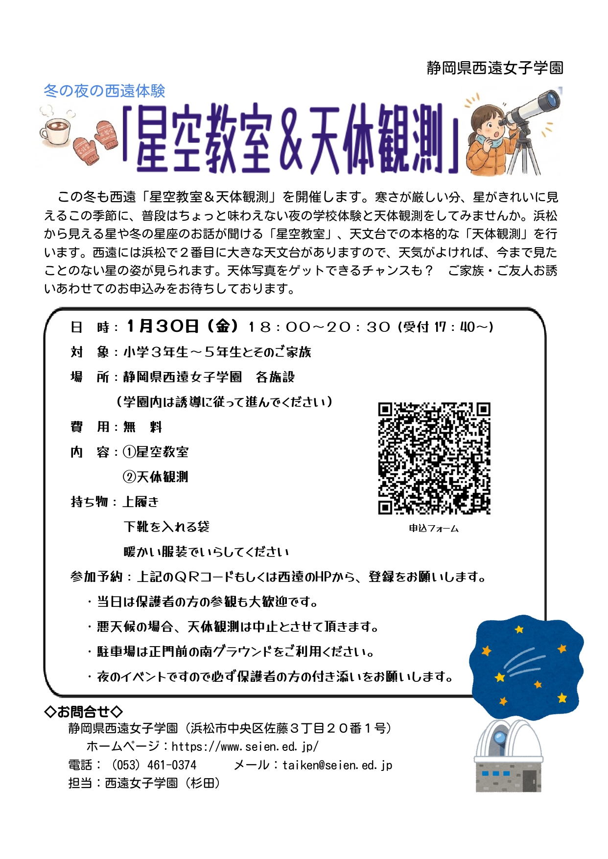 本当に寒い毎日が続いていますが、この寒い冬の時期が浜松で夜空を眺めて天体観測をする最高のときでもあります。西遠では恒例の「星空教室&天体観測」を今週1月30日(金)に開催します。西遠の天文台ではこの写真のような大きな天体望遠鏡をはじめ、様々な望遠鏡を使ってこの時期に輝く星々を観ることができます。この時期は南の空にはオリオン座がよく見え、リゲル、ペテルギウスの色の違いを見たり、ひときわ輝くシリウスに望遠鏡で迫ったりと天体ファンでなくても楽しめる要素が満載です。