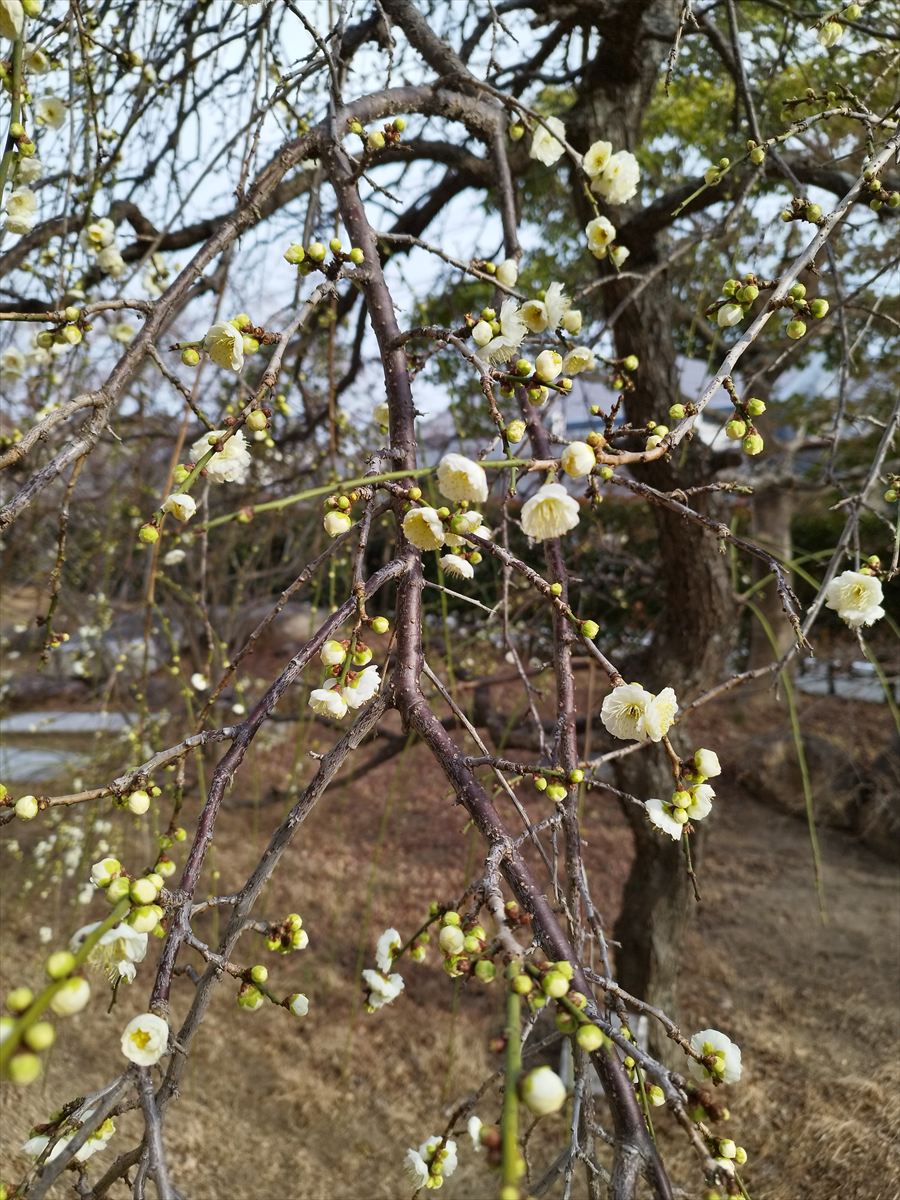 南館前の木瓜(ボケ)、生活会館庭園の枝垂れ梅(シダレウメ)も綺麗な花を咲かせていました。