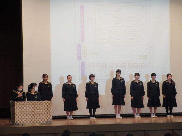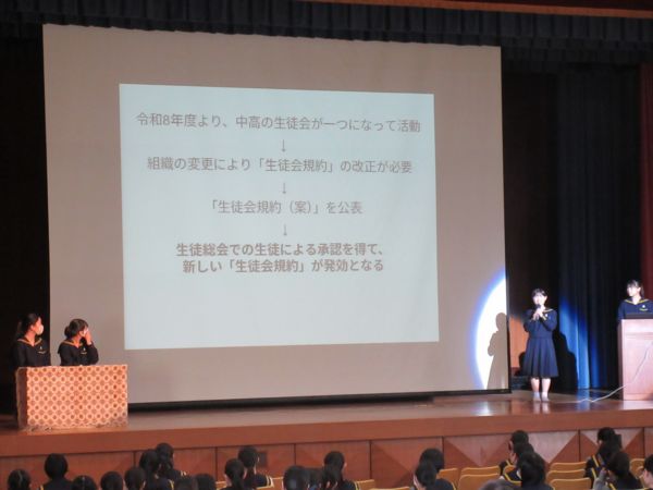 今回は中学・高校それぞれの生徒総会の後、中高合同で総会が開かれました。来年度より中高生徒会が1つになって活動することになるため、生徒会規約の改正を行うためです。