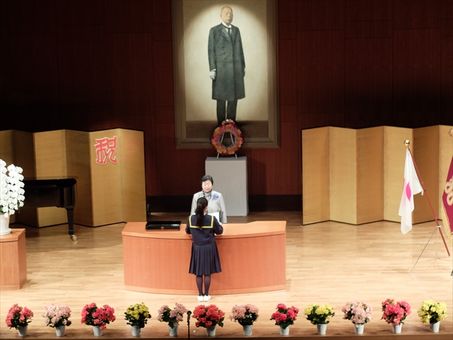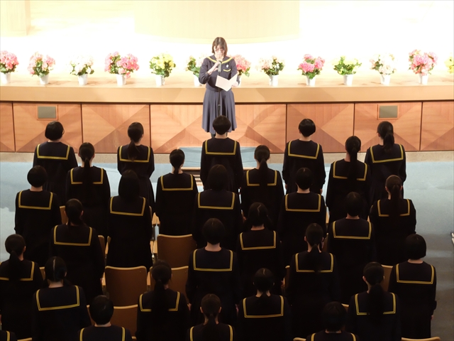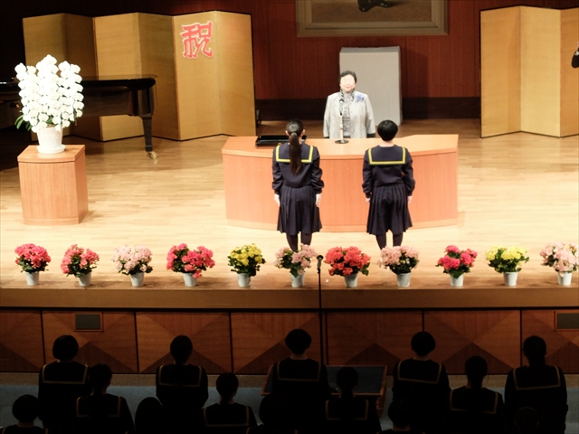 高校3年生は係生として入学式をサポートし、高校2年生は在校生として入学式に参列して、生徒会長が歓迎の言葉を述べました。