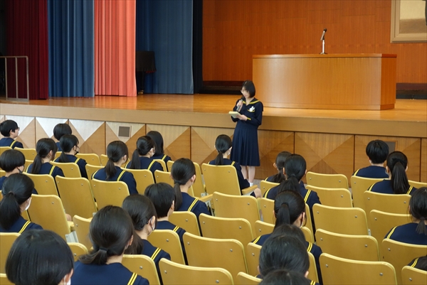 高校教頭から、今年は120周年という特別な一年であるが、まずはあなたたちの日常の学園生活を充実させることが第一である。西遠には、①生徒が優しいこと②女子だけという安心できる環境③女子だけでつくり上げる行事④国際的な行事の実践⑤挑戦する姿勢⑥部活動が豊富であること⑦礼儀正しく成長できること⑧学習にまじめにチャレンジできる、という良さがあるので役員としても誇りと自覚をもってよい実践をしてほしいと話がありました。