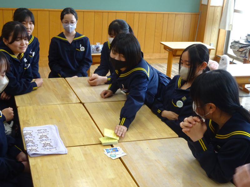 姉妹交流会 話題 2026.04.21 西遠では全校生徒が14グループに分かれ毎日の掃除等を一緒になって取り組む姉妹活動が活発に行われています。今日はその中でも昼休みに集まってレクリエーションをする姉妹交流会でした。中学1年生も楽しんでいます。 カードゲームで盛り上がるグループや 推理クイズに取り組んだり、階段ジャンケングリコをしたり 姉妹活動を通じて、下級生は上級生に憧れ上級生は下級生にいろいろなことを伝え教え、いい循環が生まれています。 (文責 岡本早織)