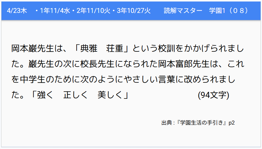 上の図は4/23(木)に実施したもので、新入生に配布する学園生活の手引きから抜粋した文章です。