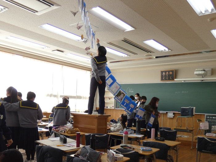 中学1年生は「掲示コンクール」仕上げの日。日本の伝統文化などを調べて掲示発表することになっています。2クラスとも、教室掲示を皆で手分けして仕上げていました。慌ただしいことが逆に楽しそうな教室です。