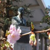 「17歳の像」の後ろに茂っている木は蝋梅(ロウバイ)です。毎年冬休みに咲く花ですが、よく見ると蕾がいっぱいです。黄色い蕾、膨らんできました。一方、その後ろの2本の裸木。左はハナミズキ、右はつい先日まで色とりどりの木の葉を散らしていたナンキンハゼです。ナンキンハゼは枝が大きく育つので、バッサリと枝葉が落とされ、次の春の芽吹きを待つ身となりました。来春の繁茂力に注目してください。
