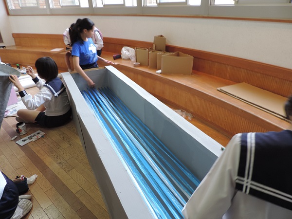 中3から高2の各クラスは、教室、廊下、いちょう広場、そして職員室まで活動の場を広げて、準備作業にあたっていました。