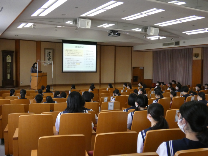 高校3年生は「話し方講座」に臨みました。株式会社はあもにいの代表取締役大野晴己様がお忙しいスケジュールの中ご来校くださり、西遠の最上級生たちのために、面接などで役立つ話し方について教えてくださいました。