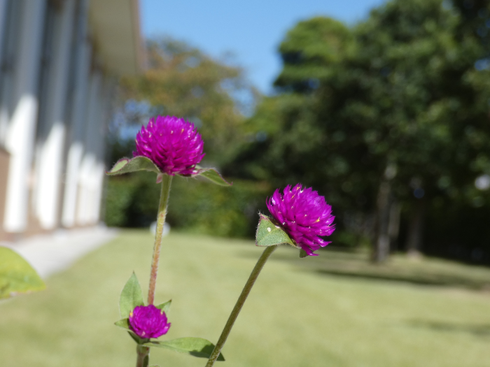 9月終わりの学園には、まだまだ咲かないキンモクセイと、ピンクのランタナ、そして、夏の余韻を残して元気に咲く千日紅。