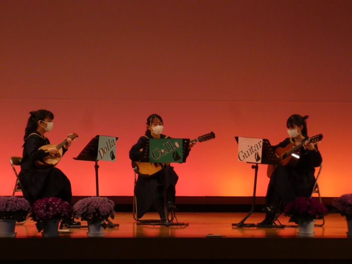 ギター・マンドリン部は、第1部から第3部までの3部構成で、換気タイムを挟んでの定期公演を開催しました。会場には、部員のご家族がソーシャル・ディスタンスを守って着席、舞台の生徒たちの演奏を撮影しながら、大きな拍手を送ってくださいました。特に、今日の講演で引退する高校2年生の3名には、ひときわ大きな拍手が。後輩たちからの花束に涙を見せた最上級生たち、今まで本当にお疲れ様でした。
