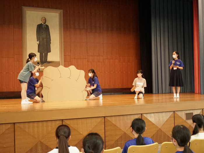 最終日には、講堂のステージで、グループのプレゼンテーションやマイストーリーの代表者が発表を行いました。グループのプレゼンはオリジナルストーリーのドラマ仕立て。皆、恥ずかしがらないで、大きな声で英語劇を作り上げていました。小道具も飛び出して、工夫が随所に施されていました。