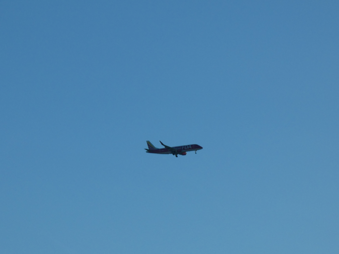 最後に、助手席から撮影したのは、鳥ならぬ飛行機。東名高速で島田に近づいたころ、飛行機が静岡空港に向かうのを見て、撮ってみました。右はアップの写真。FDAという字が映っていて、嬉しくなりました。ピンクの機体ですね。
