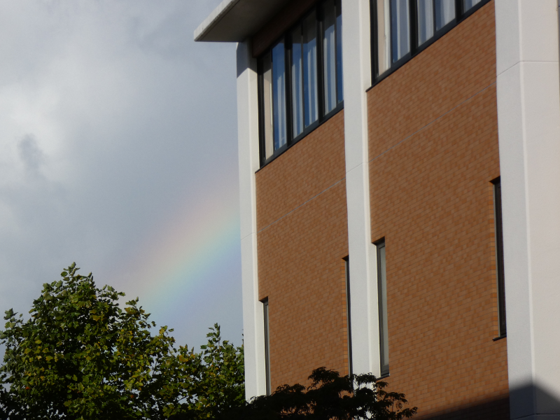 ちょうど車のBGMが「彼方の光」(リベラ)という荘厳な音楽でしたので、神々しい景色を見るようで、心が沸き立ちました。西に向かう道路も、東海道と六間道路では虹の見え方が違い、西遠に着いたらまた見える場所が違う…。ただでさえ「儚い存在」の虹ですから、「見えた!」「あ、ここでも虹が見えた!」という喜びは大事にしていたいし、一緒に見た生徒とも共有したいものです。