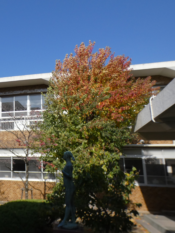 ホール棟と体育館の間には、一本のドウダンツツジが赤く色づいています。レストランに行くとき、生徒たちは目にとめているでしょうか?