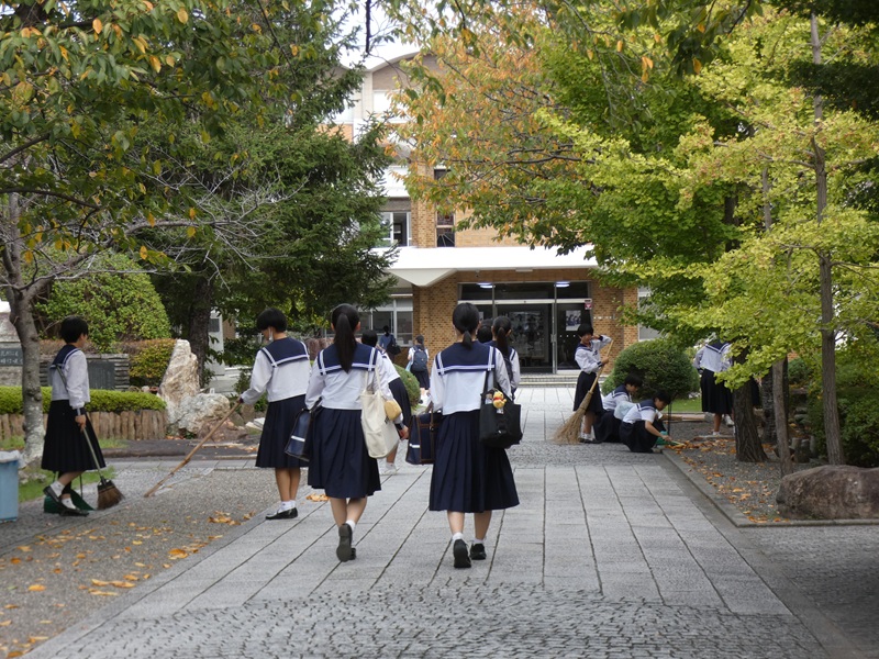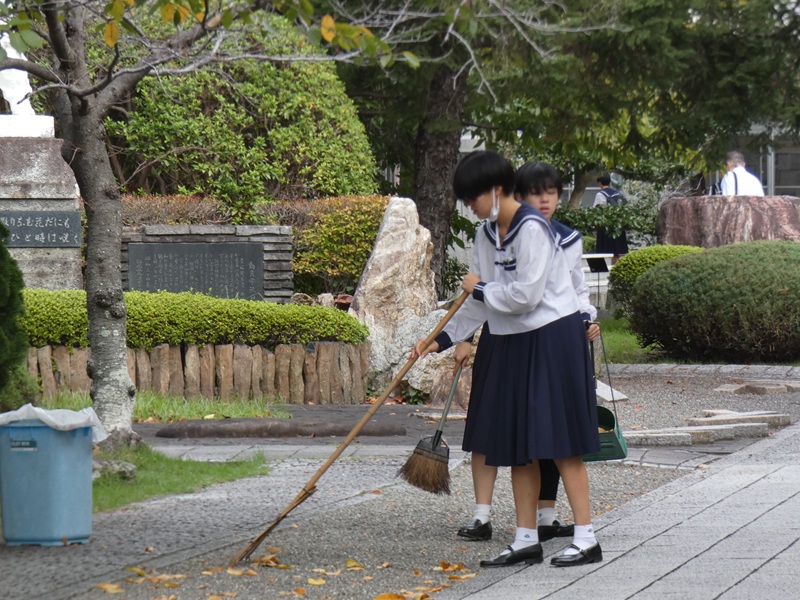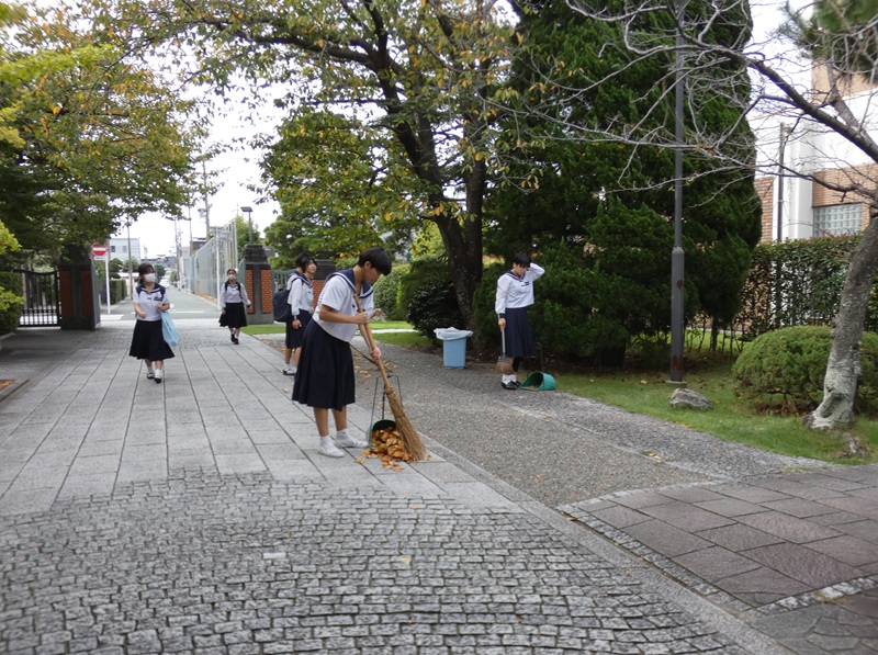 朝、登校する生徒に交じって、桜の落ち葉をかき集め、掃除に励む中学生たちがいました。