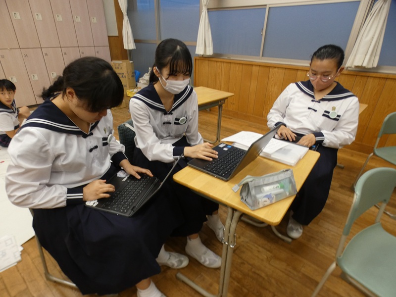 オンラインページの修正を担当するチーム。ほかにも、針金を束ねている人、模造紙に字を書いている人、このクラスは仕事の分担ができていますね。