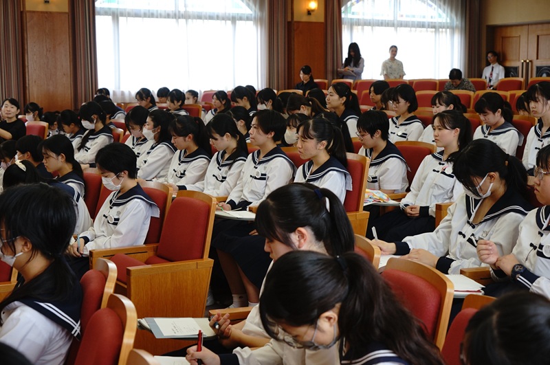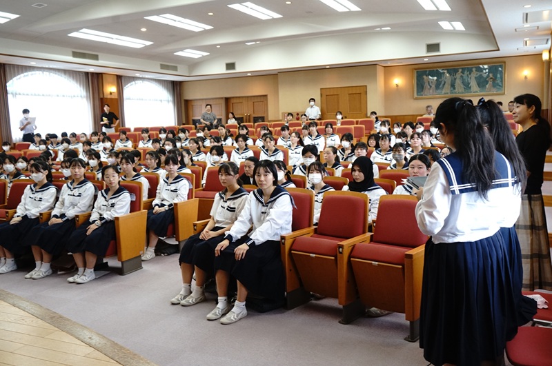 本日、高校生は「平和交流会」に臨みました。戦後80年という節目の年に、学年を超えて皆で平和について深く考える機会を持ったのです。ゲストは、5月の殉難学徒慰霊式でビデオメッセージを寄せてくださった木場笑里さんです。木場さんは、長崎の活水高校平和学習部の出身で、現在大学1年生。2023年、2024年と2年続けて、西遠の「高2九州研修旅行」で行われた長崎での平和交流会にいらしてくださいました。高校3年生にとっては、昨年10月以来の再会というわけです。
