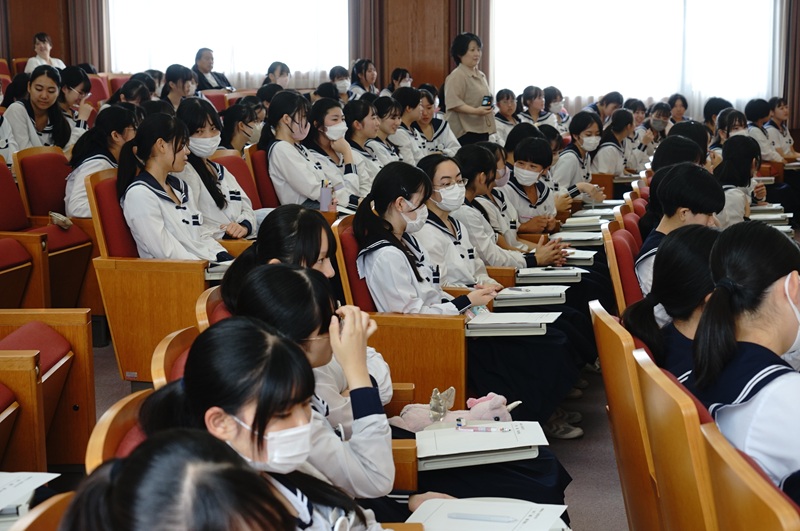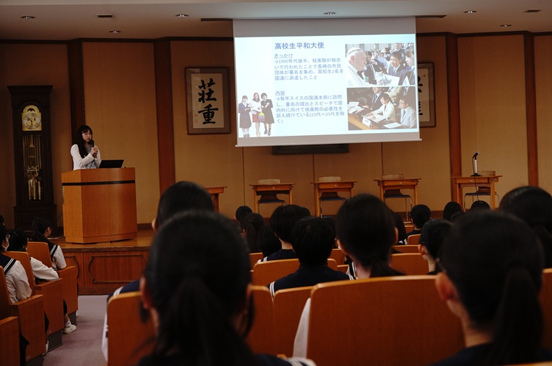 最初に、木場笑里さんが登壇、平和についてのプレゼンテーションを行いました。木場さんは、平和学習部に入ったきっかけ、高校生平和大使としての活動などを振り返り、今「平和」とどう関わっているのかを、わかりやすく説明してくださいました。そして、西遠の高校生に「平和教育をルーティン化しないこと」「『継承』の前に『正しい知識』を学んで」と訴えました。