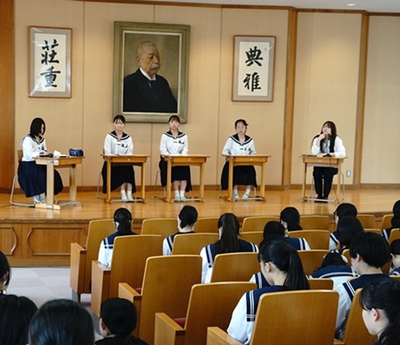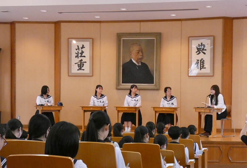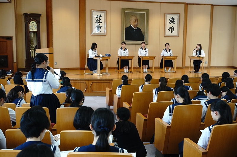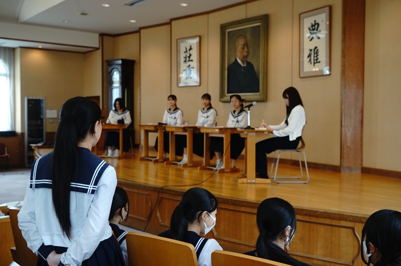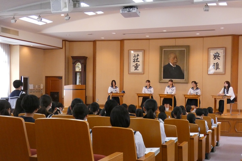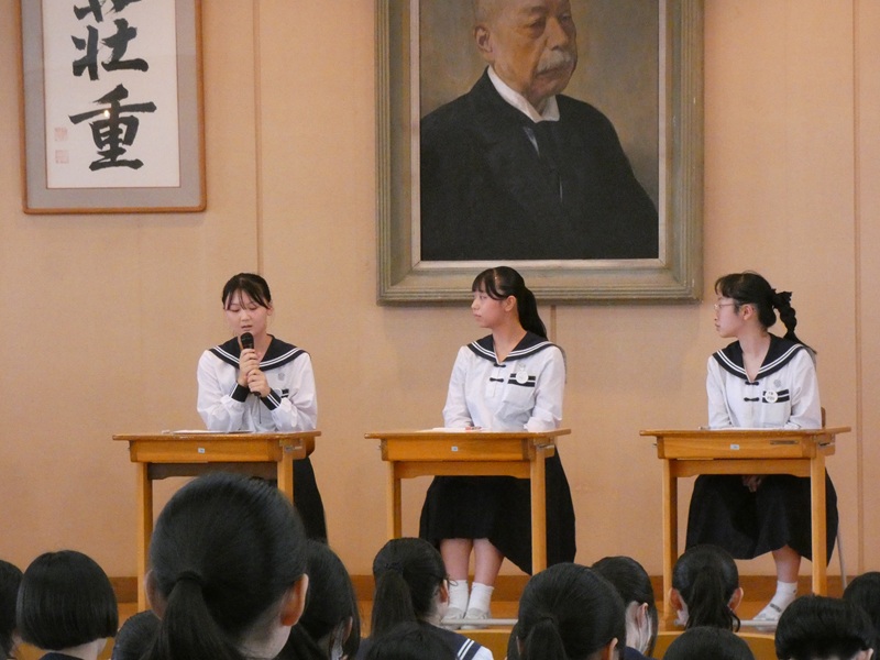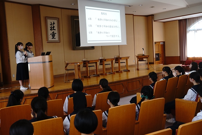 中講堂で始まった「平和交流会」は、高3の研修旅行平和委員の司会で始まりました。