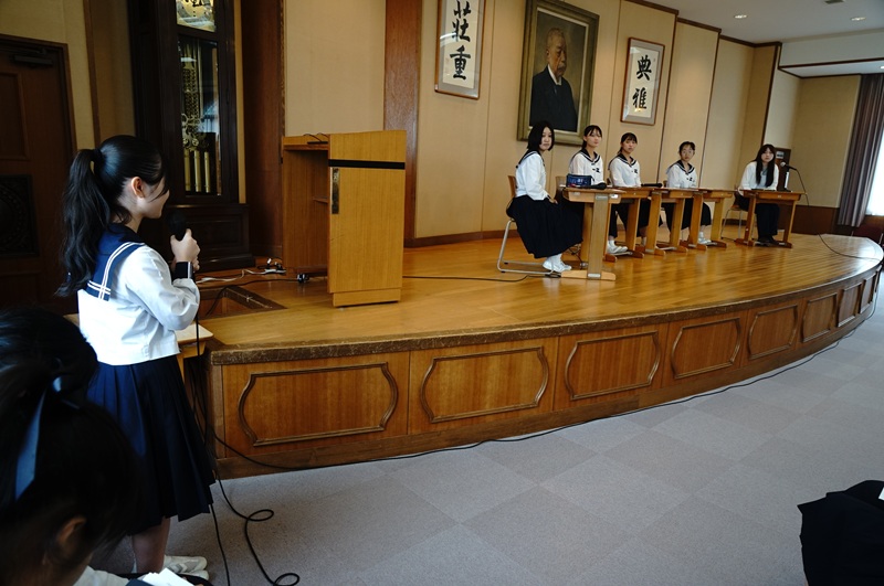 続いて、高校生と会長と友愛執行部長が、西遠の今年度の平和活動を紹介しました。殉難学徒慰霊式から「忘れないプロジェクト」への参加まで、様々な活動を振り返りました。