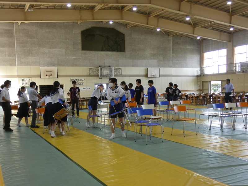 体育館に机と椅子が運び込まれました。今年は、椅子だけで気軽に座っておしゃべりできる、休憩所としてのコーナーも作りました。